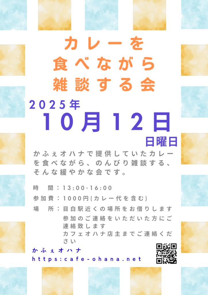 投稿日: 2025年10月2日2025年10月2日カレーを食べながら雑談する会(2025年10月) かふぇオハナで提供していたカレーを食べながら、のんびり雑談する、そんな緩やかな会です。 ●日時 10月12日(日)13時00分〜16時00分 ●場所 目白駅近くの場所をお借りします ●参加費 1000円 (カレー代込み) 参加の方は、場所をご連絡しますので、かふぇオハナ店主までご連絡ください